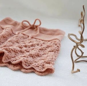 The skirt is knitted top down. You begin with stockinette stitch at the top and the Erantis lace pattern below. You pull an elastic and a cord through the cuff. Knit an I-cord edge around the waist. The Erantis lace pattern might seem uneven while knitting, but unfolds perfectly after washing and blocking.