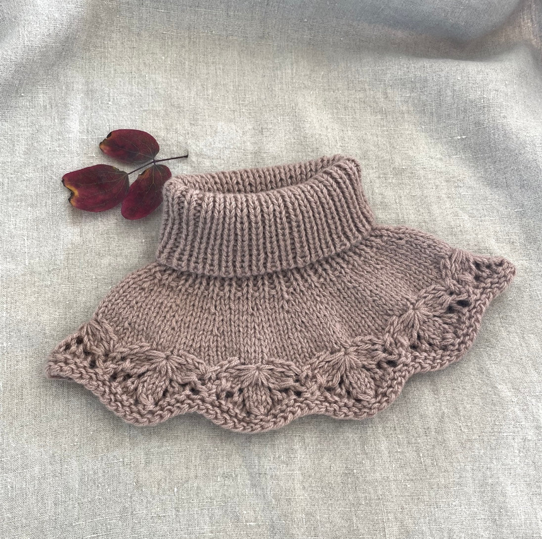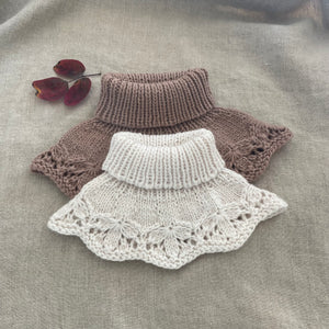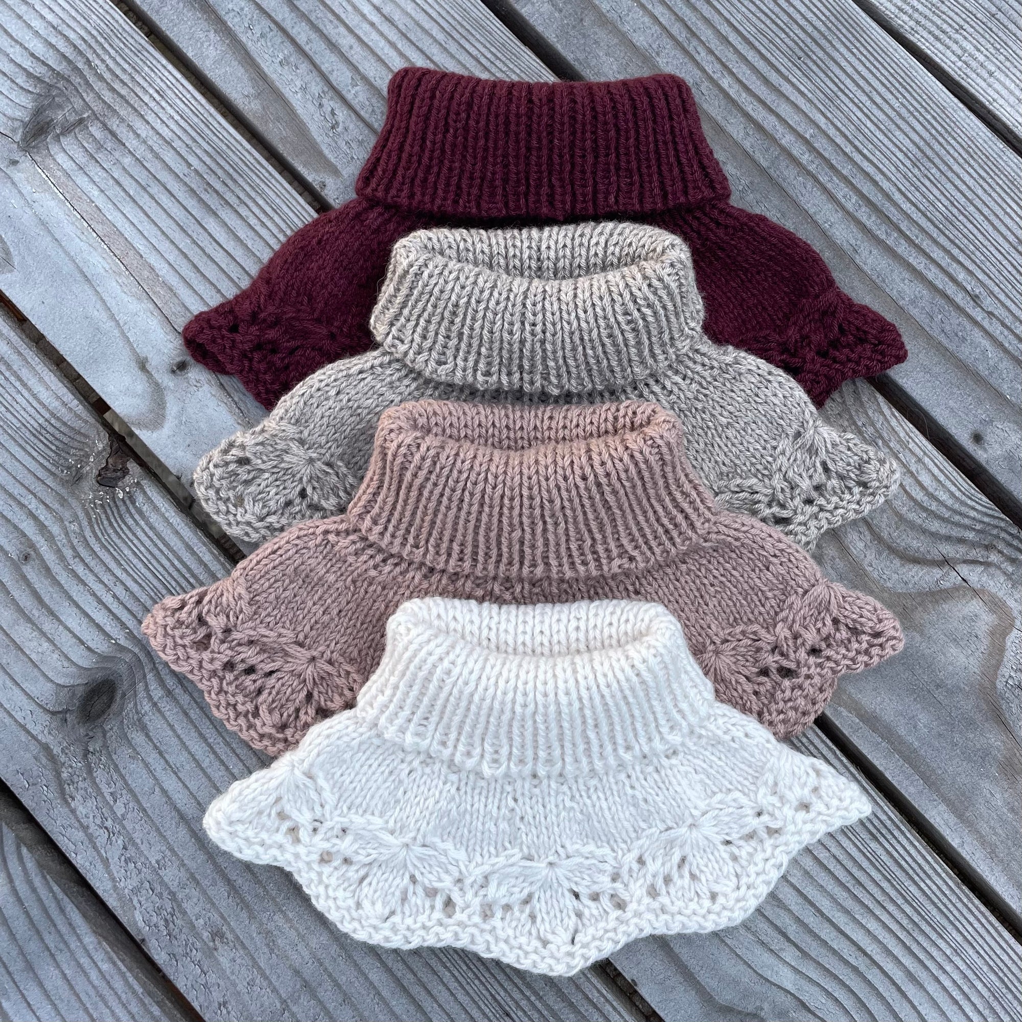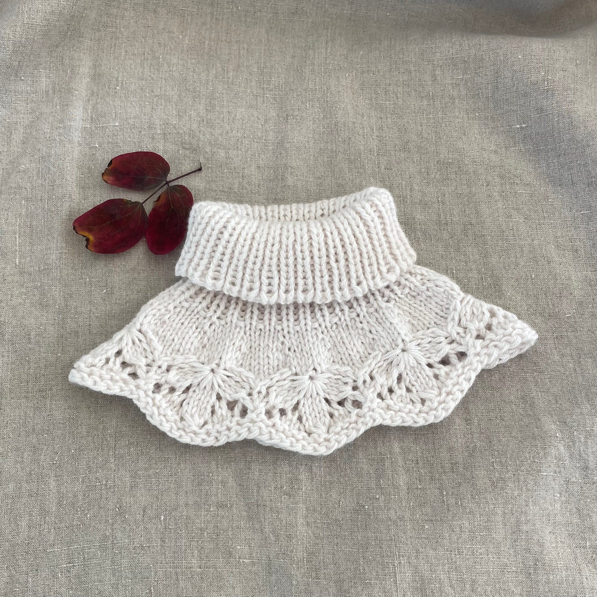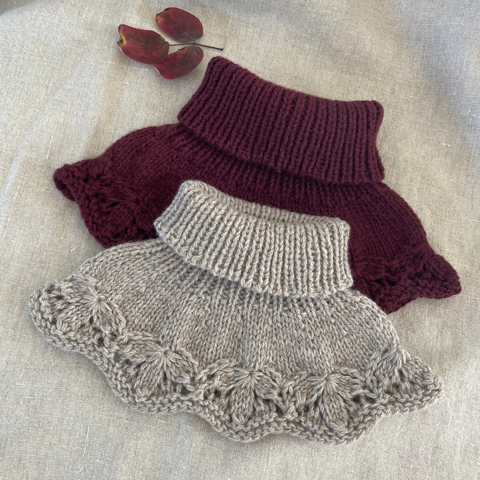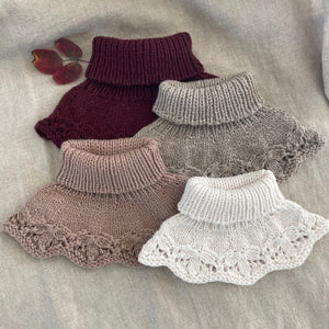 Erantis Vinterkrave Mini strikkes rundt, oppefra og ned med 2 tråde. Kraven strikkes i glatstrik med Erantis blonde nederst.