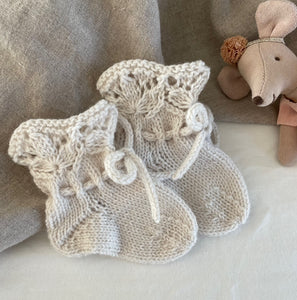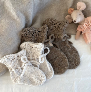 Erantis Socks Mini stickas runt i slätstickning från skaftet och ner mot tån. På skaftet stickas en Erantis-spets. Hälen formas med förkortade varv (German Short Row).